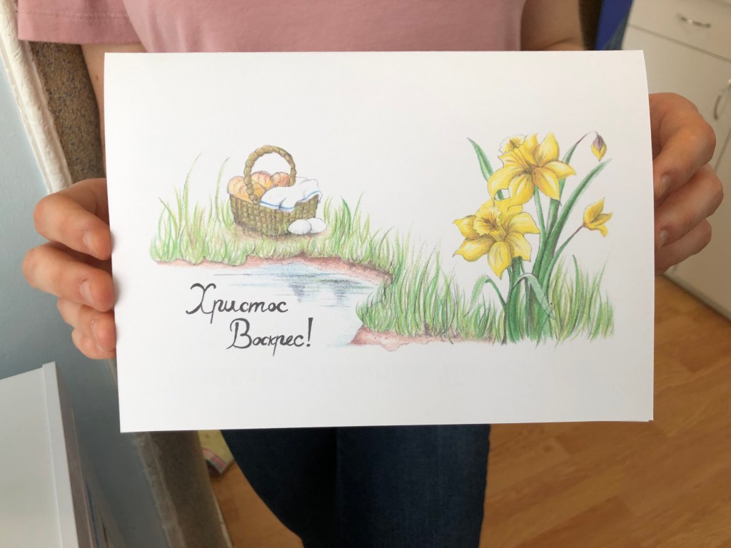 The text says, “Christ is Risen!”, the traditional Ukrainian Easter greeting. Inside, we each wrote a personal testimony of what Easter -and Christ- means to us.